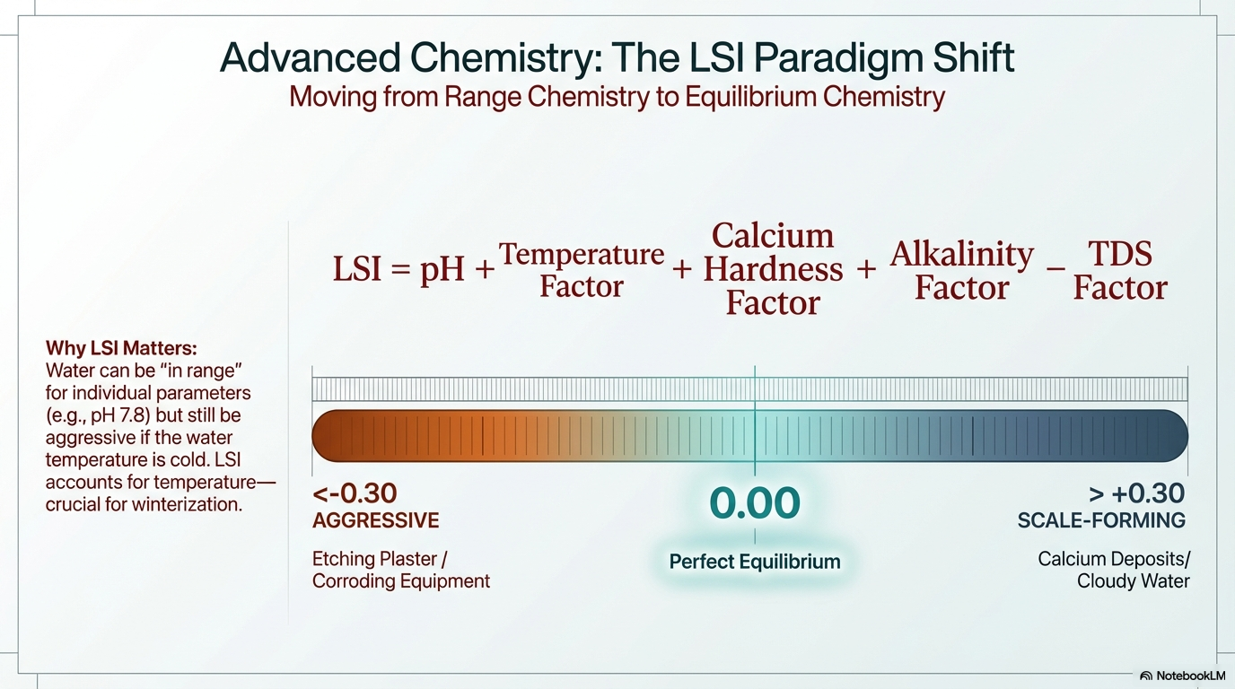 The Langelier Saturation Index (LSI): This is the ultimate “balance” score. It uses an equation involving pH, temperature, and calcium to tell you if your water is aggressive (leaching) or scale-forming (leaving crusty white deposits).